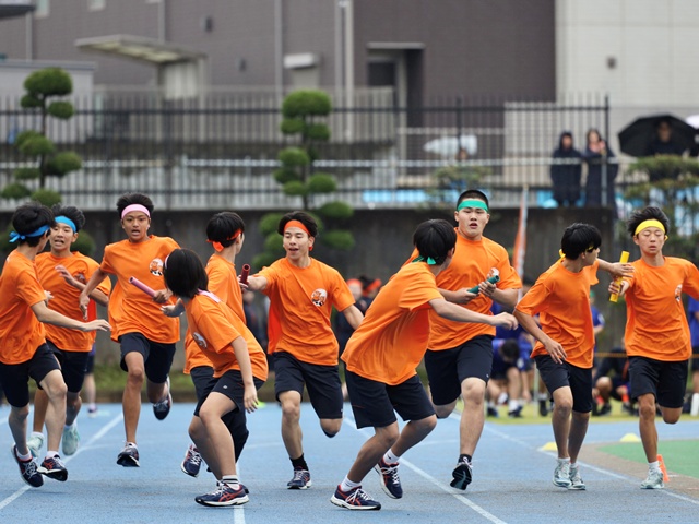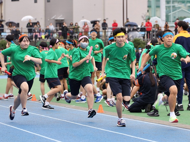 最後を飾った「クラス全員リレー」はクラス全員と担任がバトンをつなぐ種目で、体育祭の一番の盛り上がりを見せました。スタートの合図とともに、会場は大きな歓声に包まれ、抜きつ抜かれつのデッドヒートが繰り広げられました。