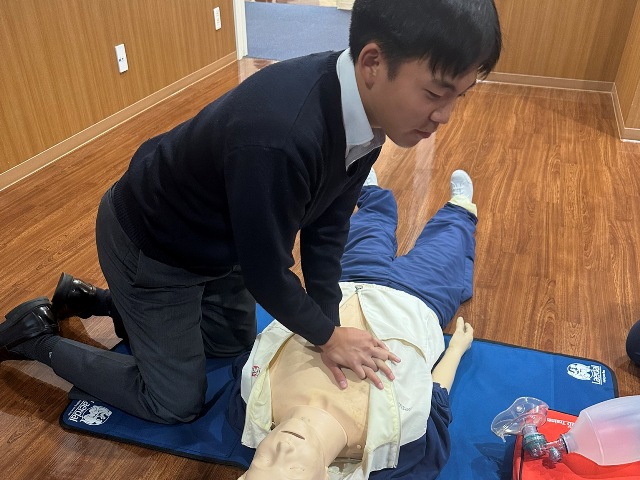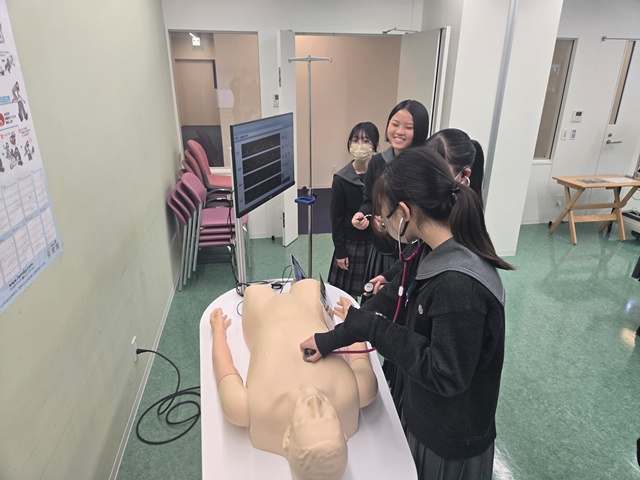 次に、施設の見学を行いました。2024年に完成した新M号館は、学生の安全面に配慮しつつ、最新の設備を備えた施設でした。また、臨床スキルスラボには実技用の器具が整っており、いくつか体験させていただきました。大学での学びや生活を具体的にイメージすることができ、身近に感じることができました。