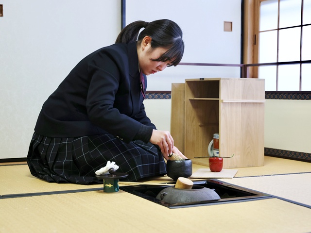お客様に、寒さの中にも春の気配を感じていただきたいという思いを込め、春先に野外でお茶を点てる際にも用いられる「旅箪笥」を使ったお点前を披露しました。今年も稽古を通して、季節の移ろいやおもてなしの心を大切にしながら、学びを深めていきたいと思います。